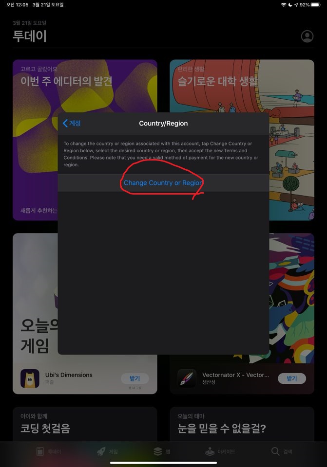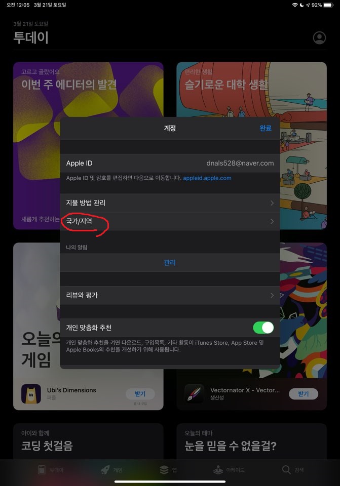 계정을 클릭하고 국가/지역을 클릭 후에 사진의 버튼을 클릭해주세요