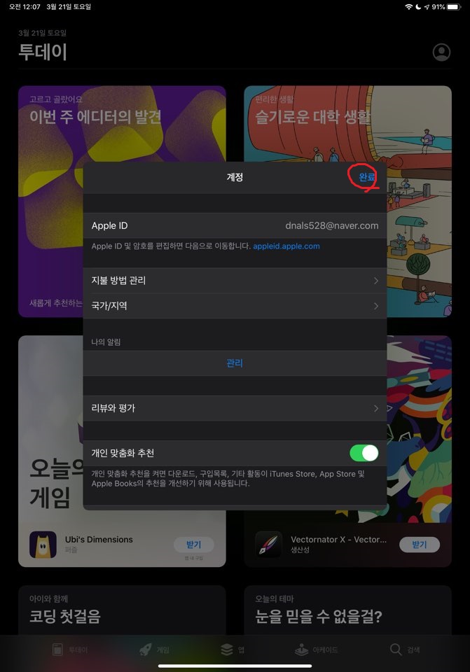 그 후에 완료를 눌러주시면 미국 앱스토어로 변경이 되는데요