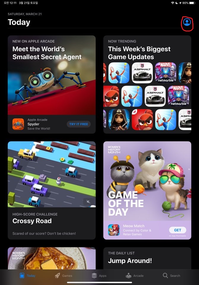먼저 앱스토에서 접속한 후에 우측 상단의 프로필 버튼을 클릭해주세요