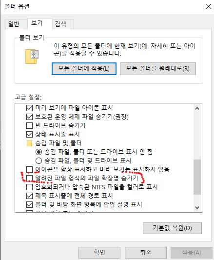알려진 파일 형식의 파일 확장명 숨기기 체크 해제