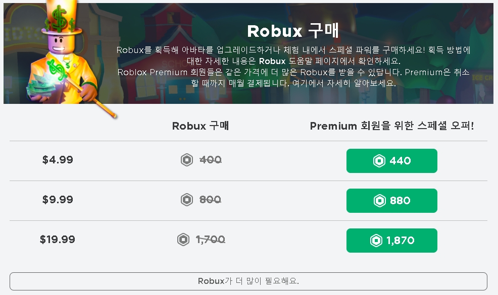 첫 번째 팁은, 로블럭스 프리미엄 멤버십에 가입하는 것입니다. 프리미엄 멤버십은 월별로 일정량의 로벅스를 지급해주고, 게임 내에서 특별한 혜택을 제공합니다. 예를 들어, 프리미엄 전용 아이템이나 할인 쿠폰, 게임 생성 및 판매 수수료 감면 등이 있습니다. 프리미엄 멤버십의 가격은 월 4.99달러부터 시작하며, 월 19.99달러까지 다양한 옵션이 있습니다. 가격에 비해 받는 로벅스의 양이 많기 때문에, 현질을 하려면 프리미엄 멤버십이 가장 좋은 선택입니다.